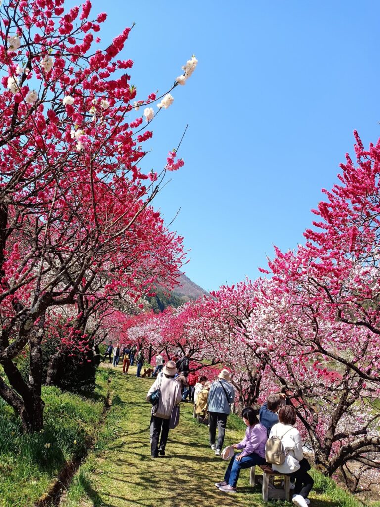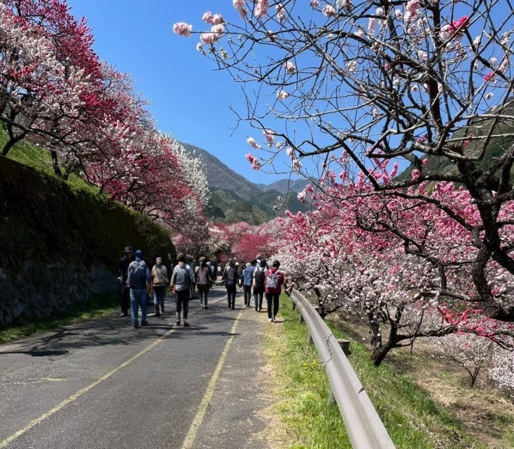 谷あいの斜面にびっしりと植えられた花桃が、視界いっぱいに広がり、歩くたびに色のグラデーションが変わっていきます。