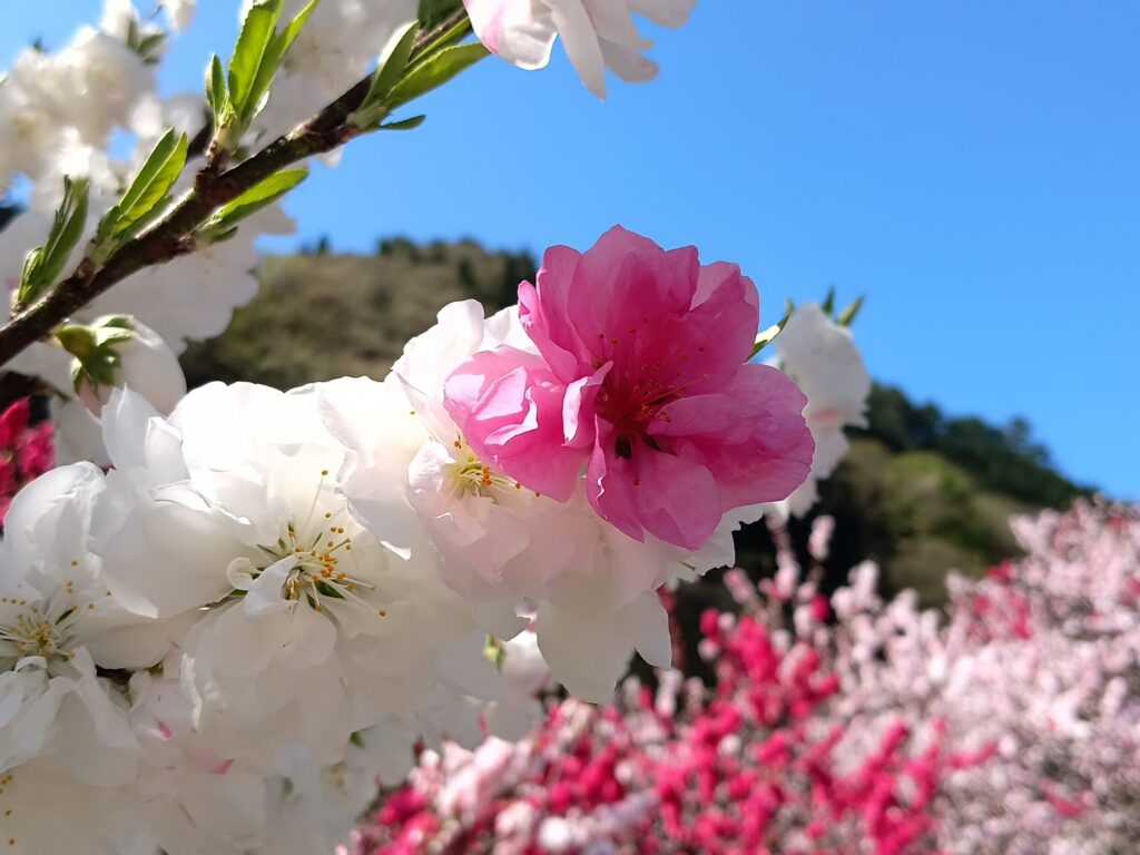 花桃の里の魅力は、なんといっても赤・白・ピンクの三色が一斉に咲き誇る圧巻の景観です。