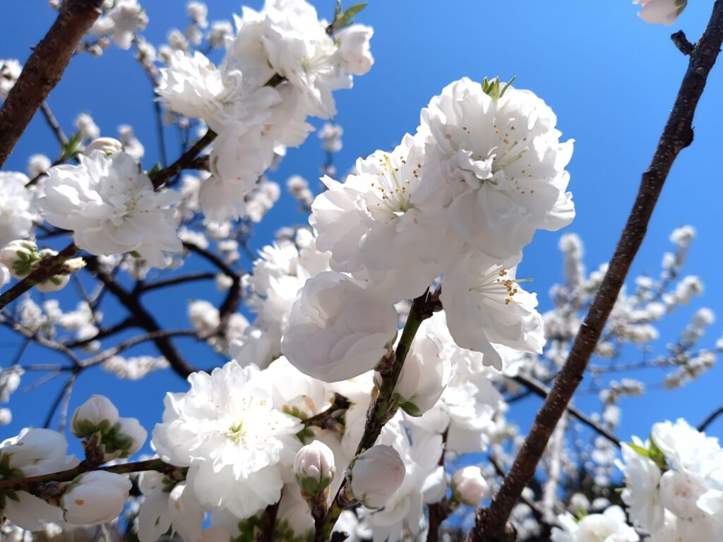 特に朝の柔らかい光と、晴天にも恵まれ、青い空に花桃の色がより鮮やかに見えてきれいな写真が撮れました。