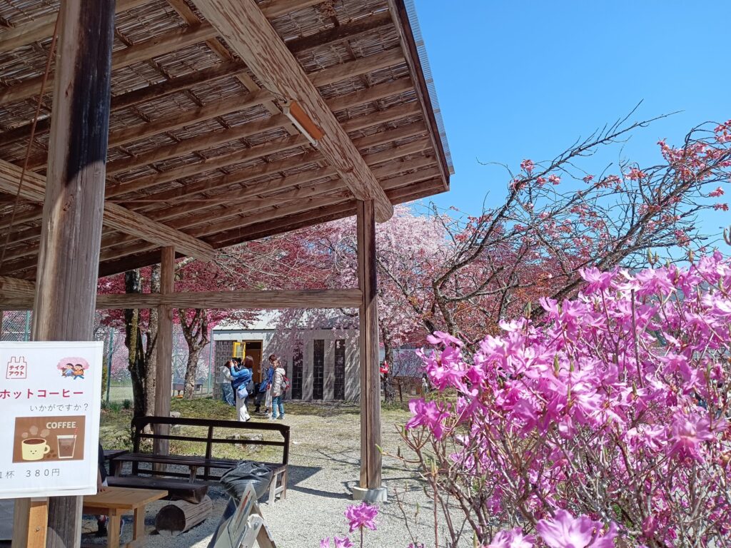 「花桃の里」の看板の後ろに、しだれ桜が咲いていました。