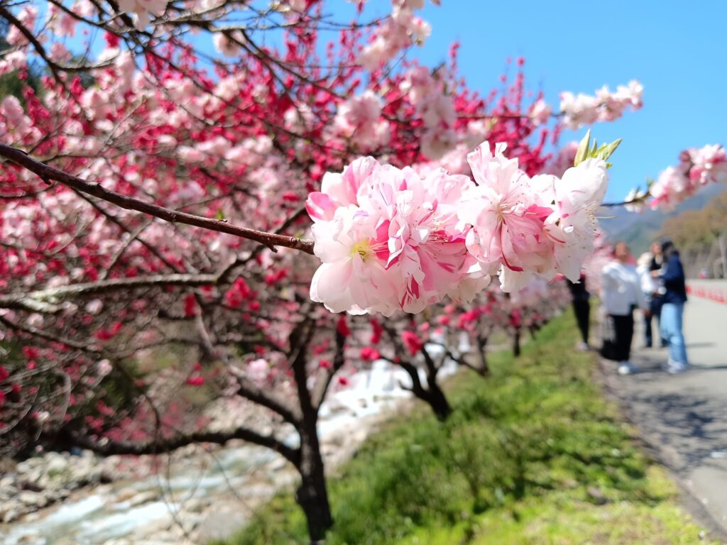 数年かけて川沿いに植えられ、現在では地域住民の方によって5000本もの花桃の草刈り、剪定などの管理が行われています。