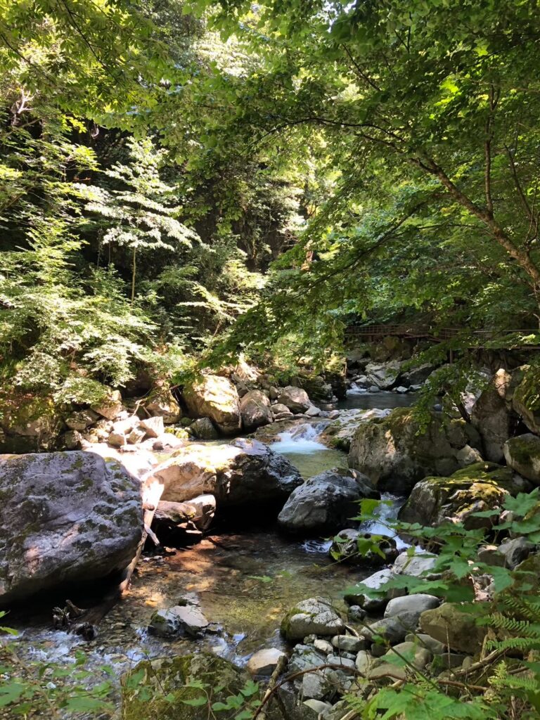 澄んだ川沿いの道は空気がひんやりとして気持ちよく、森の中に入るとまるで“もののけ姫の世界”に迷い込んだような神秘的な雰囲気に包まれます。