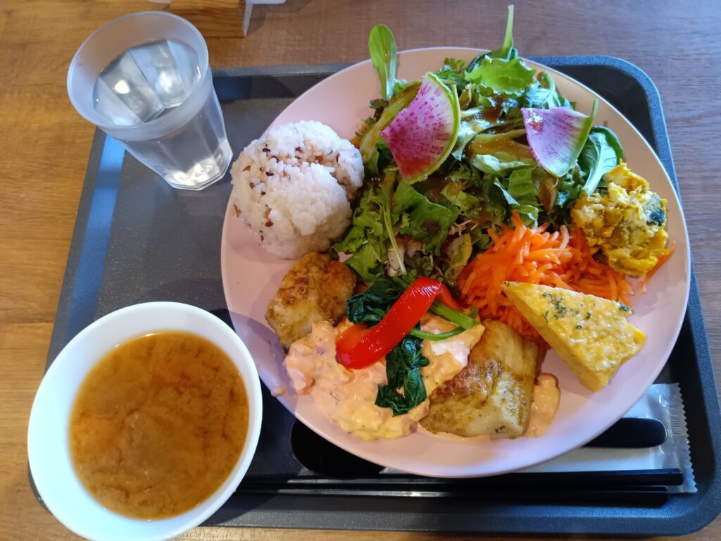 メインの鰆に、オーガニックサラダ、副菜2種、虹色米、お味噌汁がついて1450円♪