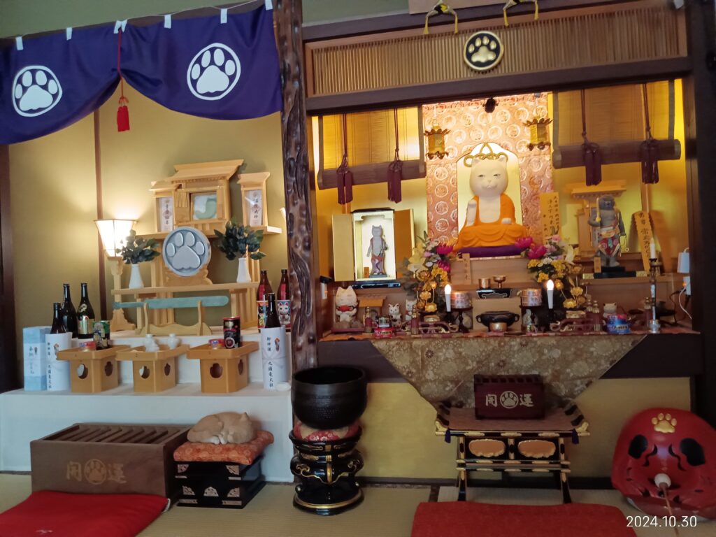 トップの写真:「猫猫寺」ミュージアム内の本堂 猫のご本尊様『大日猫来様』